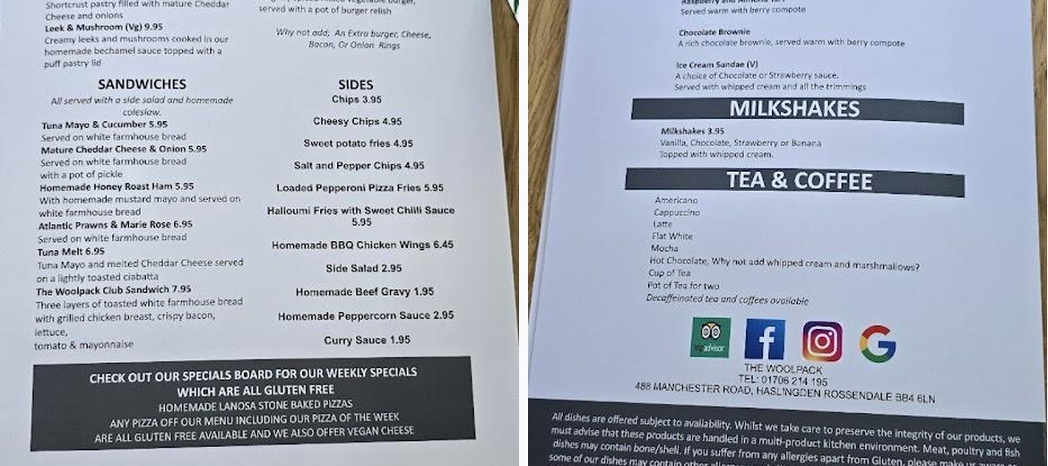 Welcome to The Woolpack, a charming family-run pub nestled in Haslingden, Rossendale, where we serve delicious homemade food daily. Our inviting atmosphere is perfect for enjoying lunch or dinner with friends and family, and we offer outdoor seating for those sunny days. Whether you're here for great beers, a comforting cup of coffee, or a delectable dessert, we cater to all tastes, including healthy options and small plates. Dog-friendly and equipped with wheelchair accessibility, The Woolpack is the ideal spot for everyone, from solo diners to larger groups. Join us for live sports, good vibes, and reservations are welcomed!Patrons rave about the generous portions and flavorful dishes that make every meal memorable. The gluten-free menu receives high praise, particularly for its extensive options that cater to dietary needs without sacrificing taste. The cozy atmosphere, paired with friendly staff, ensures a welcoming experience. Guests also enjoy the live music events that often fill the pub with an engaging and lively ambiance, perfect for social gatherings. many appreciate the great selection of beers, including craft options alongside classic favorites, enhancing the overall dining experience.